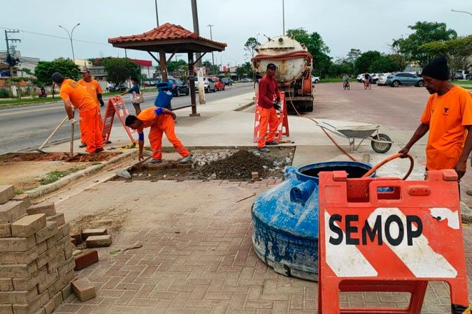 As equipes de Serviços Públicos, da Secretaria de Manutenção de Infraestrutura Urbana e Obras Públicas, estão fazendo o trabalho de readequação das calçadas, em locais com maior fluxo de pessoas e pontos de embarque e desembarque de Transporte Público.