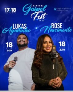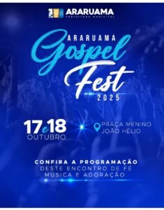 A Prefeitura vai realizar o Araruama Gospel Fest 2025. O evento vai acontecer nos dias 17 e 18 de outubro, na Praça Menino João Hélio, no Centro; reunindo grandes nomes do cenário gospel em apresentações gratuitas e abertas ao público.