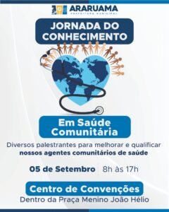 A Prefeitura de Araruama, por meio da Secretaria Municipal de Saúde, realiza no dia 5 de setembro a Jornada do Conhecimento em Saúde Comunitária. O evento será realizado no Centro de Convenções da Praça Menino João Hélio, a partir das 8h, reunindo profissionais da área, agentes comunitários de saúde (ACS) e toda a rede municipal de atenção à saúde.
