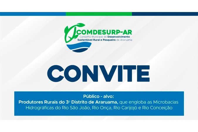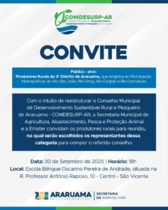 A Prefeitura de Araruama, por meio da Secretaria Municipal de Agricultura, Abastecimento, Pesca e Proteção Animal, e a Emater convidam os produtores rurais do terceiro distrito de Araruama, São Vicente, para uma importante reunião, onde serão escolhidos os novos representantes do Conselho Municipal de Desenvolvimento Sustentável Rural e Pesqueiro de Araruama. O encontro será realizado no dia 30 de setembro, às 18h, na Escola Bilíngue Oscarino Pereira de Andrade, localizada na Rua Professor Antônio Raposo, nº 10, no Centro de São Vicente.