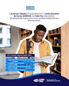 A Secretaria de Assistência Social, por meio do Acessuas Trabalho, firmou uma parceria com o Centro Brasileiro de Cursos (CEBRAC), de Cabo Frio. A rede vai ofertar 200 vagas gratuitas para cursos de qualificação imediata, com certificado incluso.