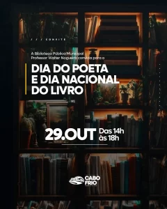 A Biblioteca Pública Municipal Professor Walter Nogueira promove, no dia 29 de outubro, uma tarde especial em celebração ao Dia do Poeta e ao Dia Nacional do Livro. As atividades acontecem das 14h às 18h, na sede da Biblioteca, localizada na Praça Dom Pedro II, nº 47, Centro de Cabo Frio, e promete uma programação repleta de cultura, arte e emoção.