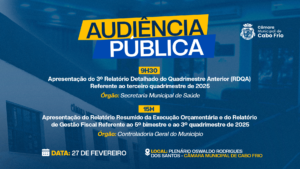 Nesta sexta-feira (27), a Câmara Municipal de Cabo Frio recebe audiências públicas para apresentação de relatórios de prestação de contas da Secretaria Municipal de Saúde e da Controladoria Geral do Município referentes ao exercício de 2025. A sessão acontece no Plenário Oswaldo Rodrigues dos Santos e está aberta à participação da população.