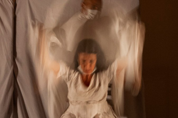 A encenação privilegia o gesto como elemento central, em uma escrita que se constrói para além da palavra. Com forte dimensão visual, o espetáculo convida o público a uma experiência sensorial, abrindo espaço para reflexões sobre silenciamentos, abusos de poder e os estigmas associados ao papel da mulher na sociedade. A montagem dialoga com os universos de Margaret Atwood, Mary Shelley e Nise da Silveira, especialmente na construção de imagens e na articulação entre arte e subjetividade.