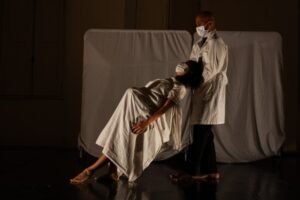 Ainda em 2023, o trabalho estreou como espetáculo no Circuito Cultural UFMG, em Belo Horizonte. A escuta sensível do público — marcada por relatos de identificação e reconhecimento — atuou como força propulsora para o aprofundamento da obra, que passou a expandir suas camadas dramatúrgicas e eixos de investigação. Ao longo desse percurso, Hystera se consolidou como uma criação que tensiona os limites entre o íntimo e o político, entre o corpo vivido e o corpo atravessado por dispositivos de controle.