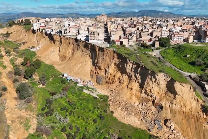 Casas na cidade siciliana de Niscemi ficaram à beira de um precipício após um deslizamento de terra provocado por uma tempestade, informou o chefe da Defesa Civil italiana nesta terça-feira (27).