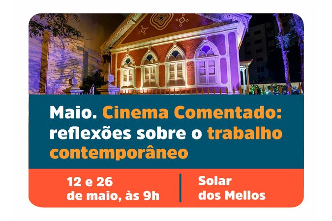 Cinema Comentado realizado no Solar dos Mellos no mês de maio de 12 e 26, terá como tema: Trabalho dignifica?. As sessões são sempre às 9h. A atividade é gratuita e aberta ao público com a proposta de depois da exibição dos filmes realizar um bate-papo com os participantes.