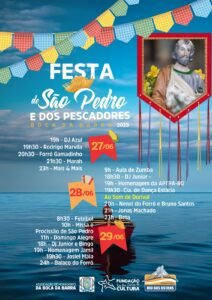 Organizada pela Associação de Moradores de Boca da Barra, em parceria com a Prefeitura e a Fundação Rio das Ostras de Cultura, a Festa de São Pedro terá início na sexta, 27, às 19h. A abertura fica por conta do DJ Azul, preparando o clima para a noite. O primeiro show será de Rodrigo Marvila, que tem uma trajetória musical de mais de 20 anos. Em seguida, o Forró Gamadinho celebra os grandes mestres do forró pé de serra. A energia contagiante de Marah, artista de axé com hits autorais, vem logo depois. Para encerrar, o grupo Mais & Mais apresenta sucessos do pagode.