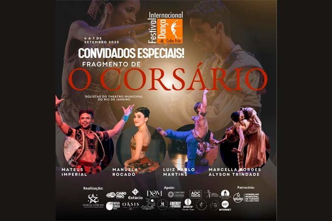 No dia 5, no final do bloco Ballet de Repertório, uma apresentação com convidados especiais, para um momento inesquecível: A apresentação de um fragmento do clássico “O Corsário”, interpretado por solistas do Theatro Municipal do Rio de Janeiro. No elenco, Mateus Imperial, Manuela Rocado, Luiz Paulo Martins, Marcella Borges e Alyson Trindade. Será uma apresentação única que promete encantar o público com técnica, emoção e a grandiosidade de um dos balés mais aclamados do repertório mundial.