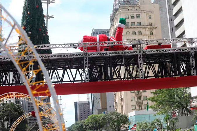A forte ventania que atinge São Paulo derrubou Papai Noel da decoração de Natal da Avenida Paulista — Foto: Reanto S. Cerqueira/ Ato Press/Estadão Conteúdo