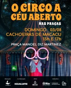 Idealizado e dirigido por Fabiano Freitas, o palhaço Piter Crash, o espetáculo O Circo a Céu Aberto chega aos espaços públicos dos municípios de Cachoeiras de Macacu (3/8 – às 15h e 17h), Guapimirim (10/8 – às 12h e 17h) e Itaboraí (17/8 – às 15h e 17h) para resgatar a atmosfera poética do encontro, do aplauso, do sorriso, do despertar para a imaginação por meio da linguagem do palhaço – comédia física e a arte de rua que recriam números inspirados em esquetes tradicionais da palhaçaria brasileira, transformando espaços públicos numa catarse coletiva de gargalhadas.