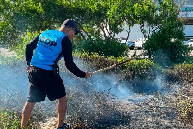 A Guarda Civil Municipal de Cabo Frio, por meio do Grupamento Operacional de Praia (GOP), atuou na tarde desta quinta-feira (15) no combate a focos de incêndio na vegetação da Avenida Litorânea, na Praia do Forte.