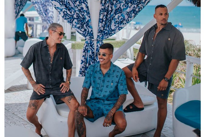 As fotos revelam um ambiente sofisticado, com clima praiano e toque de lifestyle premium, reforçando que a moda periférica evoluiu, conquistou espaço e agora disputa terreno com grandes labels do mercado nacional. Na imagem que viralizou, os três modelos exibem diferentes combinações da coleção, criando uma identidade forte, moderna e alinhada às tendências internacionais.