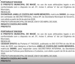 O cenário político em Magé começa a ganhar novos contornos após movimentações recentes na estrutura administrativa do município. Atos oficiais publicados no Boletim Informativo confirmam a exoneração de Jamille Cozzolino de cargos estratégicos que ocupava na Prefeitura, com efeitos a partir de 04 de abril de 2026.