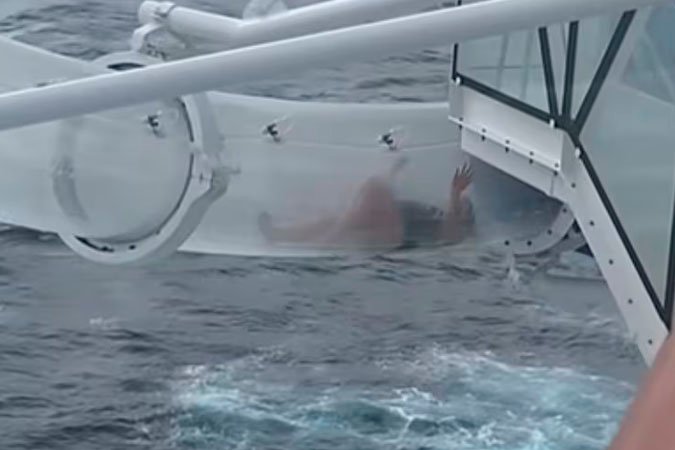Uma passageira ficou presa em um toboágua a quase 50 metros acima do oceano durante um cruzeiro no Alasca. Um vídeo que registra o momento tem viralizado nas redes sociais nos últimos dias.