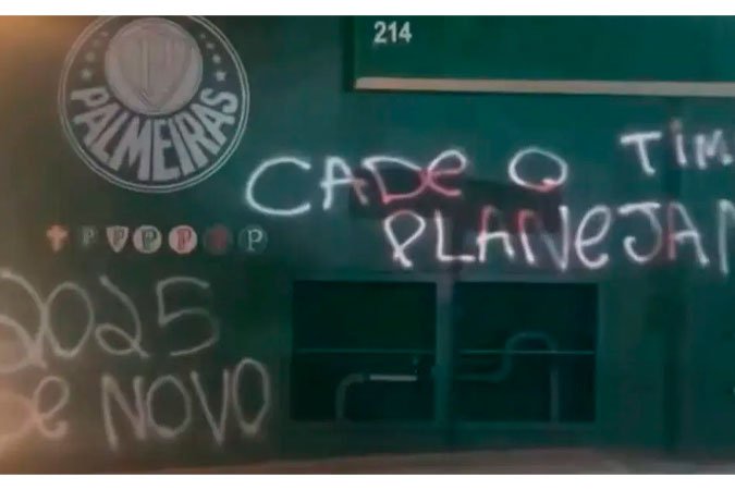 – Cadê o planejamento?; 2025 de novo; SPAlmeiras; time sem vergonha; Leila, seu negócio é roubar; cadê o planejamento? – foram as frases escritas nos muros.