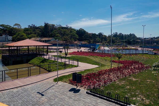 Conta também com uma ciclovia que circula todo o parque e paisagismo com variedade de plantas, estacionamento e acessibilidade.