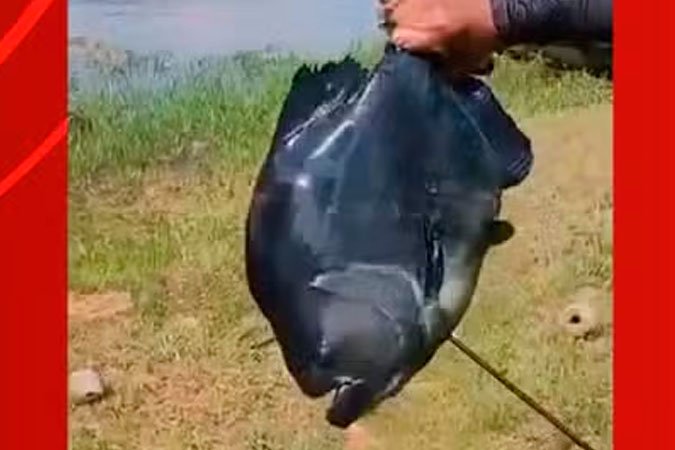 Um vídeo publicado nas redes sociais mostra um pescador exibindo a piranha-preta “gigante” logo após a captura.
