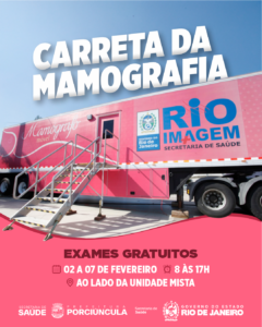 A Carreta da Mamografia estará em Porciúncula entre os dias 2 e 7 de fevereiro, das 8h às 17h, estacionada em frente à Policlínica, que agora está funcionando ao lado da Unidade Mista de Saúde. No local, serão oferecidos exames gratuitos de mamografia e ultrassonografia, com foco no diagnóstico precoce do câncer de mama.