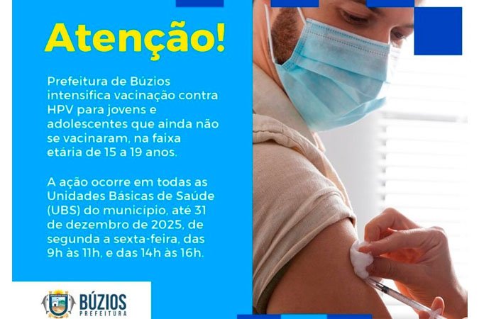 A Prefeitura de Búzios, por meio da Secretaria Municipal de Saúde, está intensificando a vacinação contra o HPV (Papilomavírus Humano) para jovens e adolescentes que ainda não se vacinaram, na faixa etária de 15 a 19 anos. A ação ocorre em todas as Unidades Básicas de Saúde (UBS) do município, até 31 de dezembro de 2025, de segunda a sexta-feira, das 9h às 11h, e das 14h às 16h.