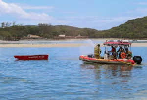 A ação foi realizada próximo à Ilha do Japonês e simulou um incêndio em embarcação, com pronta resposta para o controle do foco incendiário e resgate das possíveis vítimas.