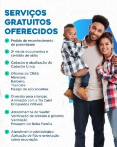 * Assistência social: cadastro e atualização do Cadastro Único, oficinas do CRAS nas áreas de barbeiro, manicure, trancista e design de sobrancelhas;