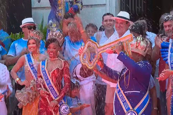 O prefeito Eduardo Paes entregou nesta sexta-feira (13) as tradicionais chaves da cidade ao Rei Momo Danilo Vieira, marcando oficialmente a abertura do carnaval no Rio. A cerimônia foi realizada no Palácio da Cidade, em Botafogo, na Zona Sul.