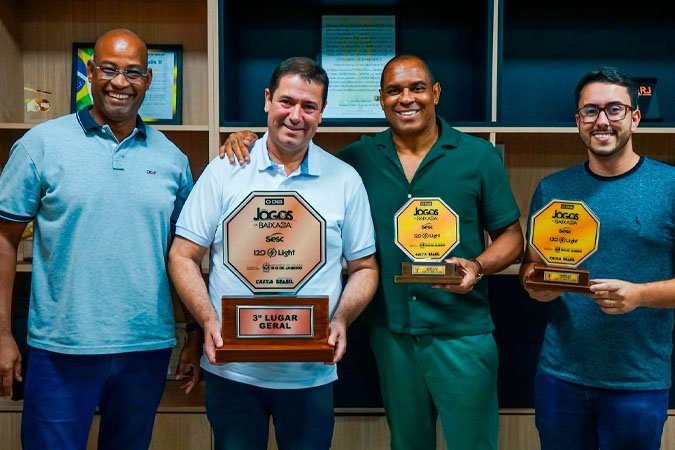 Durante a apresentação dos troféus no gabinete do prefeito Léo Vieira, o ex-jogador Donizete prestigiou a celebração, reforçando o valor do incentivo esportivo na Baixada Fluminense.