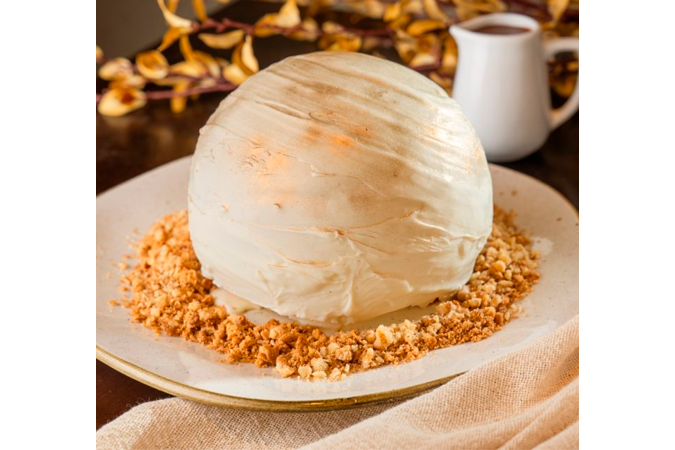 Esfera de chocolate branco nobre recheada com brownie, sorvete de creme e morangos, finalizado com crumble amanteigado e calda belga meio amarga.