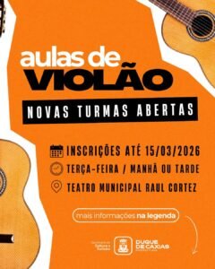 A Secretaria Municipal de Cultura e Turismo (SMCT/DC), por meio do Teatro Municipal Raul Cortez, abriu inscrição para novas turmas do curso gratuito de violão: do básico ao avançado. As aulas começam em abril e funcionarão no modo presencial.