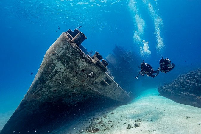 Leva apenas alguns minutos para descer pelas águas cristalinas, mas parece que estamos voltando no tempo. Esvazio meu BCD (dispositivo de controle de flutuabilidade) e afundo através dos raios de sol até que o naufrágio começa a se materializar, primeiro como sombras, depois como estrutura.
