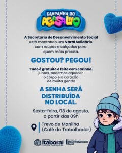 A solidariedade vai aquecer o coração e o corpo de quem mais precisa em Itaboraí. A Prefeitura, por meio da Secretaria Municipal de Desenvolvimento Social (SEMDS), promove mais uma edição da Campanha do Agasalho, com a realização de um Varal Solidário gratuito, na próxima sexta-feira (08/08), a partir das 9h, no Trevo de Manilha, próximo ao Café do Trabalhador.